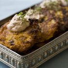 | Since the first day of Hanukkah falls on Thanksgiving this year, we decided to draw on a staple of that all-American holiday to make a delicious variation - pumpkin latkes. We top ours with a cranberry-spiked sour cream, but applesauce would be just as delicious.